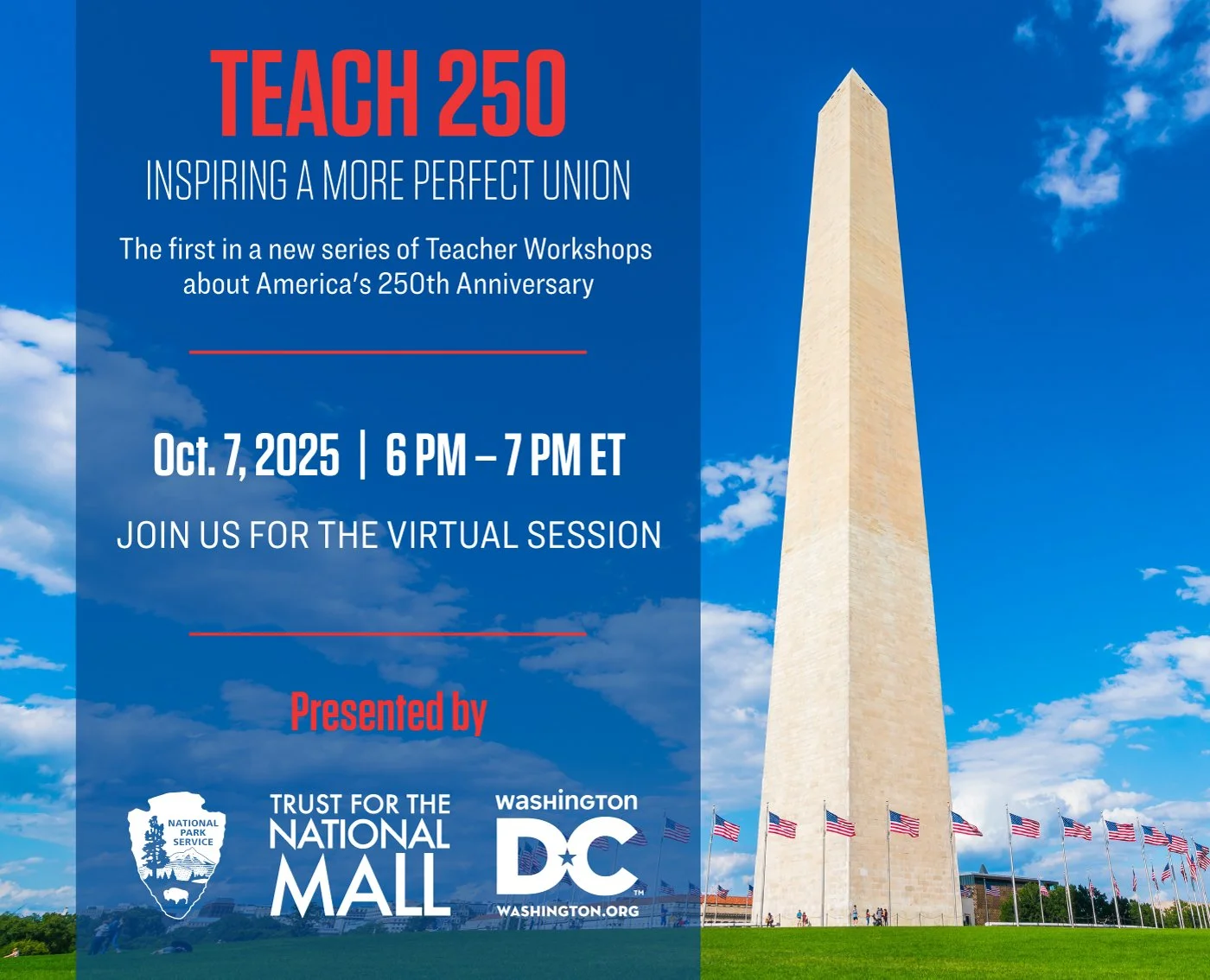 Educators are invited to join the Trust for the National Mall, National Park Service and Destination DC to kick off this year's series of Teach 250: Inspiring a More Perfect Union. Leading up to the historic 250th anniversary of American independence in 2026, this teacher workshop series is designed to help prepare educators for the upcoming 250th anniversary of the Declaration of Independence by exploring ways to celebrate, honor, commemorate, and dive deep into America's 250 years of history.