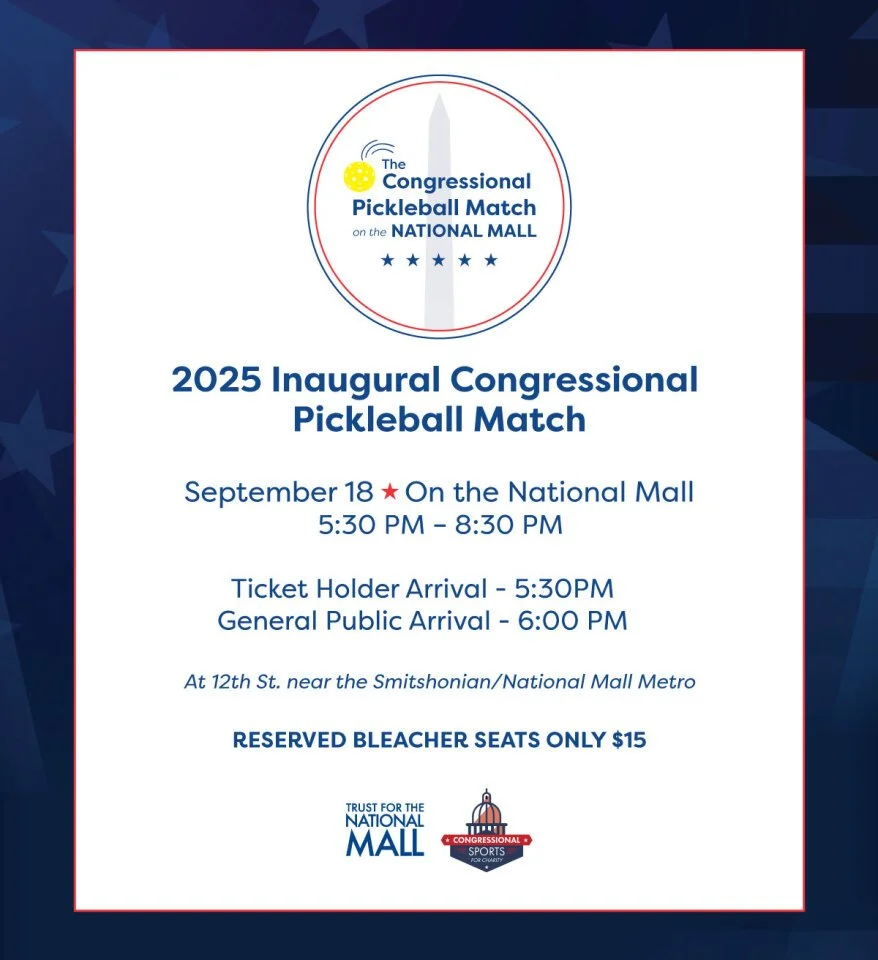 Purchase a ticket or become a sponsor for the Inaugural Congressional Pickleball Match on the National Mall—an unforgettable evening of sports, civic engagement, networking and fun. This is a preview event taking place the night before the official kick-off of the National Mall of Pickleball, the free, three-day event presented by the Trust for the National Mall and Humana, Inc.