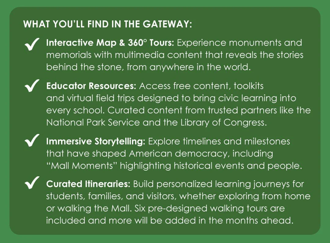 “The National Mall Gateway is one-of-a-kind digital and onsite learning platform is designed to connect students, educators, and the public to the history and the guiding principles represented by the National Mall, its landmarks, and the historic events that have shaped the United States.” — Catherine Townsend